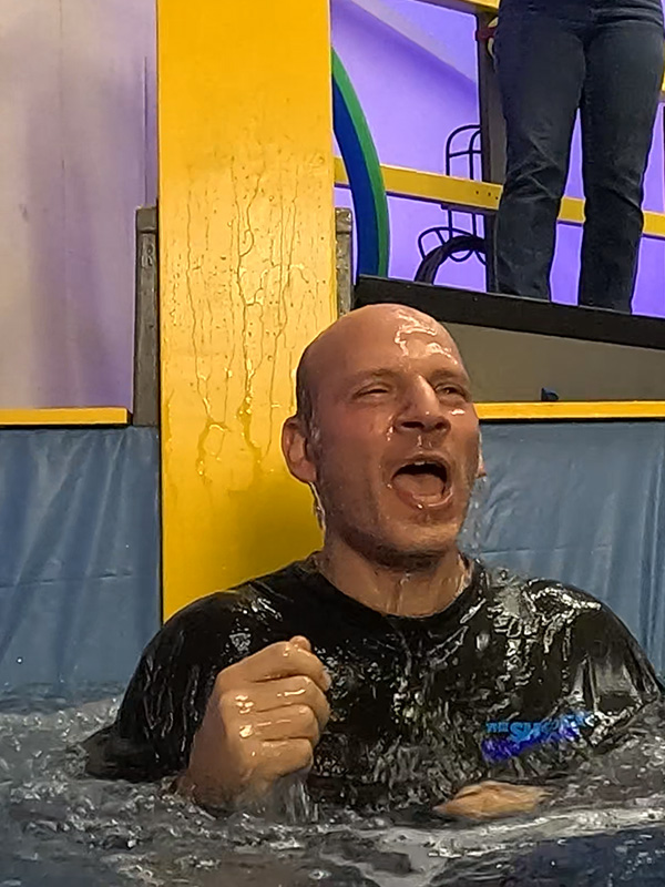 Marc gasped when he fell into the cold-water tank; it was shocking how cold it was. He had the same shocked feeling when he fell into the warm-water tank, except that he thinks the shock of the cold water made him inhale a little bit of water, which didn’t happen in the warmer water.